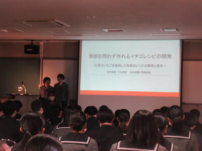 課題研究の授業では、各班食品科学に関する課題を設定し、解決を図るため、食品科学科で学んだ専門知識や技術を生かし、問題解決の能力や自発的、創造的な学習を行ってきました。