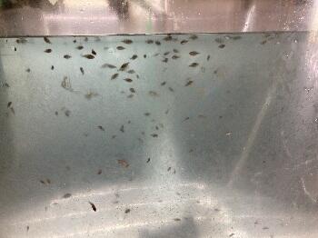 ふ化から1ヶ月以上経ちました。このサイズになってくると配合飼料(粉状)を与えるため、水槽底に残餌や代謝物(糞等)が溜まります。そのため、毎日、水槽の底を丁寧に掃除して水槽の環境をきれいに保っています。