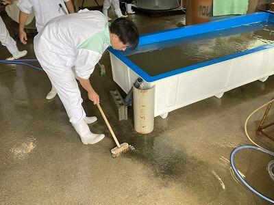 ②大型コンクリート水槽に稚エビを放す様子