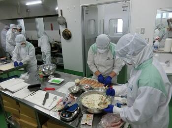 魚肉コロッケは、キャベツ、タマネギ、ニンジンなどの野菜をふんだんに使用し、成形後、パン粉をまぶして揚げた料理で、本校で製造を行なっている天ぷら(さつまあげ)とはまた違った練り製品です。