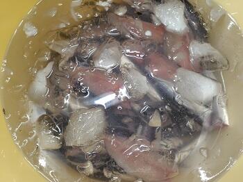 | カレールーを計量中… | 魚をぶつ切りにします |