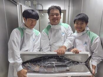| マグロと一緒に記念撮影! | 大きなマグロと格闘中… |