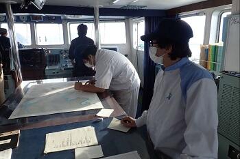 出入港の前日は航路を海図と航海計器に記入します。回数を重ねるたびに早く終わるようになっており、生徒達は日々成長しているのを実感しています。