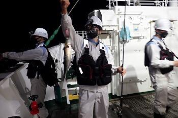 この二日間は、錨泊して釣りを行なったようです。13日(火)はサワラが大量に釣れ、14日(水)はミズイカが釣れ、釣り実習後には生徒達が自分たちで魚をさばき、刺身にして美味しくいただいたそうです。