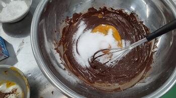 溶かしたチョコにバターを入れ混ぜた後に、生クリーム、砂糖、卵黄をいれ油っぽさがなくなるまで混ぜます。