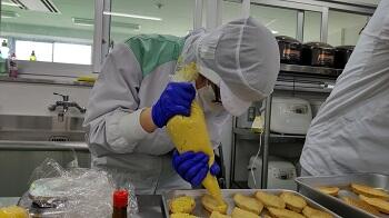 スイートポテトタルトは、紅芋パウダーを入れた物と黄色ぽい普通のペーストの2種類を作り、以前焼き上げていたタルト台に絞り出しました。生徒達は最初絞り出すときは、うまく出来ず手こずっていた様子でしたが作業が進むにつれて綺麗な形が出来る様になっていました。