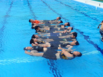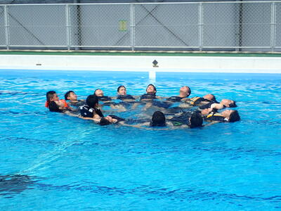 船舶の救命講習を学校のプールで行いました。救命筏に乗り込む方法や海上で生存と発見率が上がる密集陣形など、実際に行うことで知識と技術の習得します。