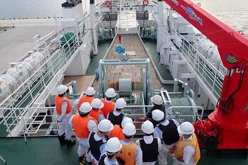 入港後すぐにデッキクレーンの操作練習を行いました。生徒達は、操作の感覚をつかむのが難しく恐る恐る動かしていました。