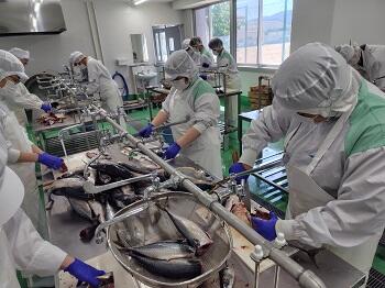 | サバを缶の高さに合わせてカットします | サバを計量して缶に詰めます |