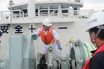 また、投錨に使用するウィンドラス(アンカーチェーンやロープを巻きとる)の操作も生徒達が行っており、慣れてきた様子で取り組んでいました。わからないことは後ろについて操作を見守っている乗組員の方々に伺いながらしっかりと作業に取組んでいます!