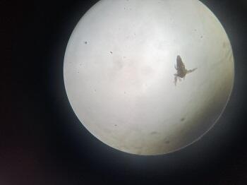 ふ化から16日経ちました。鰓(えら)やそれを守るための鰓蓋(えらぶた)も確認できるほどに成長しました。これまではワムシを給餌し続けていましたが、ある程度成長し、口も大きくなってきたため、ワムシよりも1サイズ大きいアルテミアを与え始めました。