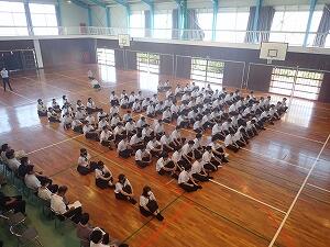 続いて行われた始業式では、鬼塚校長が「2学期も仲間を大切にすること。さまざまな行事を通して、みんなが成長できる学校にしよう。3年生はいよいよ進路達成の時、自分の目標を掴み取ろう。1・2年生は3年生の姿を通してどのような力が必要か思いを巡らせ、自分の力につながる行動をしよう。」とあいさつしました。