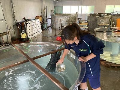 マダイがふ化して約50日経ちました。餌として粉状の配合飼料を与えていますが、10分、20分と餌をやり続けても食べます。この時期は一気に成長が進むため、すでに3cm程度のマダイもでてきました。いっぱい食べる様子に癒やされた1日となりました。