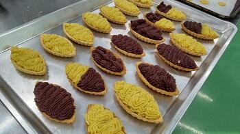 スイートポテトタルトは、紅芋パウダーを入れた物と黄色ぽい普通のペーストの2種類を作り、以前焼き上げていたタルト台に絞り出しました。生徒達は最初絞り出すときは、うまく出来ず手こずっていた様子でしたが作業が進むにつれて綺麗な形が出来る様になっていました。