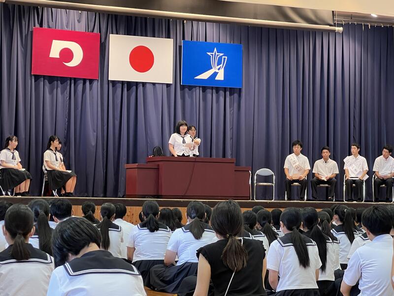 全校集会では、今月の目標である「夏バテに負けるな!」の提言やメディア委員会から夏休みの本の貸し出しについてのほかに、今週金曜日に行われる生徒会役員選挙に向けての注意事項などが全校生徒に伝えられました。