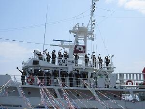 富岡港にて出港式を行いました。本日出港式に臨んだ3年海洋科学科海洋航海コースの生徒19名は、緊張感に包まれながらやる気に満ちた様子でした。熊本丸は、本校生徒や保護者、御来賓のみなさま、苓北中学校3年生、近隣保育園の園児などに見送られ出港しました。本日の1次航海を皮切りに、運航実務実習や沿岸漁業生産実習が始まります。