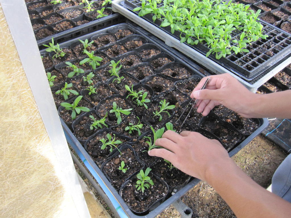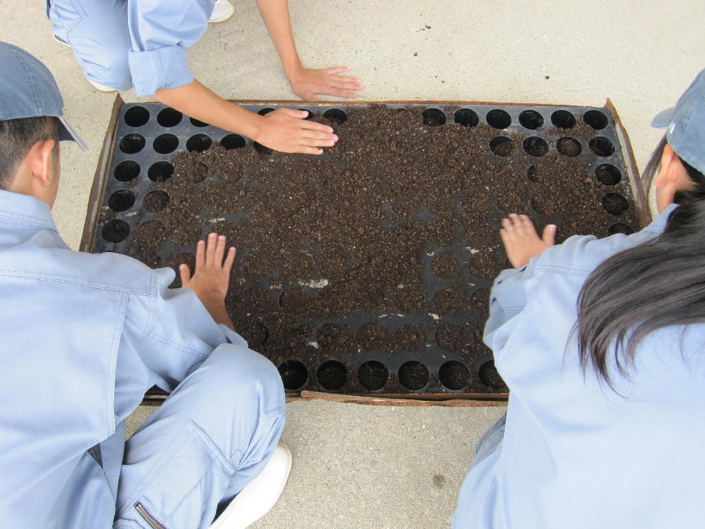 9月7日(木)に種まきし、約5週間育苗したナデシコを鉢上げしていきます。ポットの中心になるように苗を植えていきます。セルトレイから苗をピンセットで取り出すのに少し苦戦した生徒もいましたが、無事ナデシコの鉢上げを終えることが出来ました。