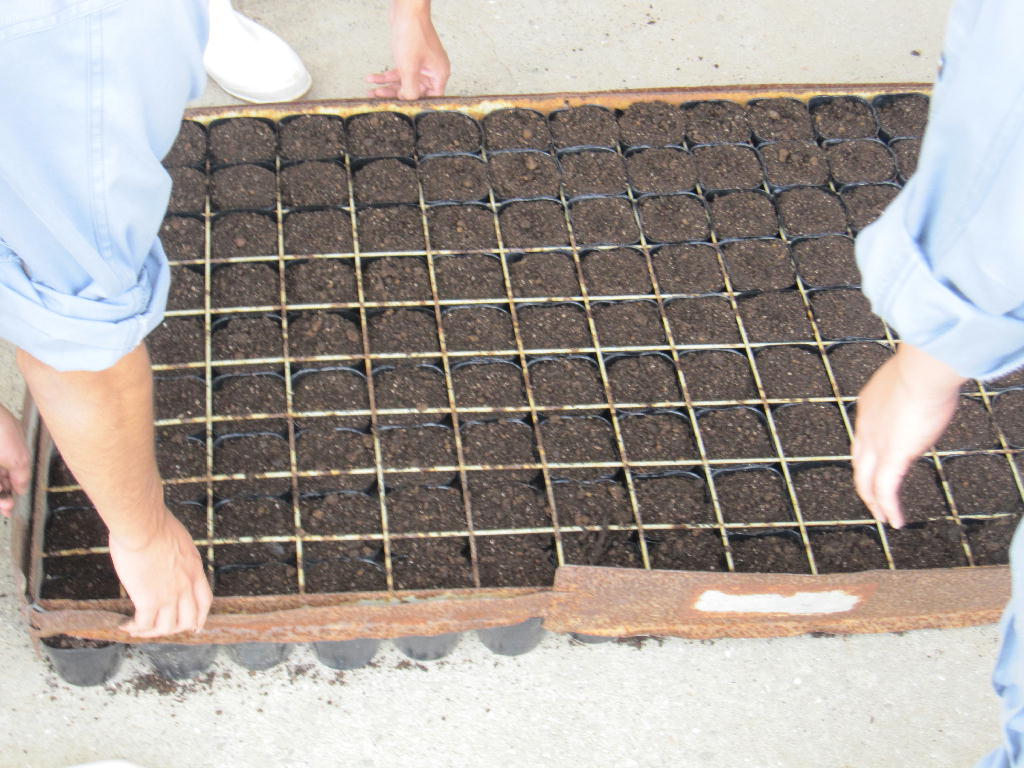 200穴セルトレイから3号ポットに鉢上げ行いました。ポットに用土を詰めていくのにスピードポッターという道具を使用して用土を詰めていきました。大量に鉢上げするときなどによく使う道具です。