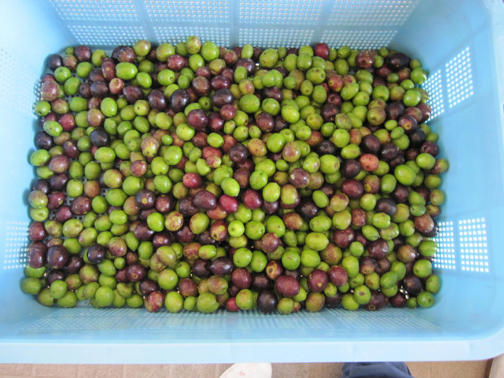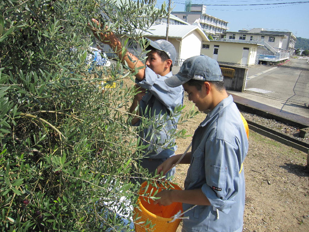 本校で栽培している「オリーブ」が収穫時期になったので生物生産科・生活科学科2年で一斉に収穫しました。オリーブオイルにするためには、24時間で一定の量が無いと機械で絞れないので2クラスで収穫しました。
