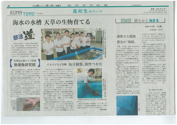 10月13日金曜日の熊本日日新聞にマリン校舎の「熱帯魚研究部」の活動様子が掲載されました。
