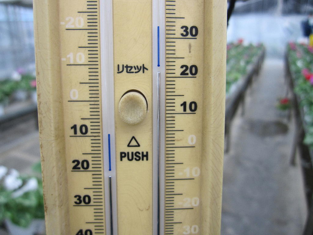 左:写真が温室の中の温度計で、右:写真が温室の外の温度計です。最低温度を比べてみると温室内が20℃、温室外が17℃で3℃の差があります。温室内が寒くならないように側窓にビニールのカーテンを設置しました。
