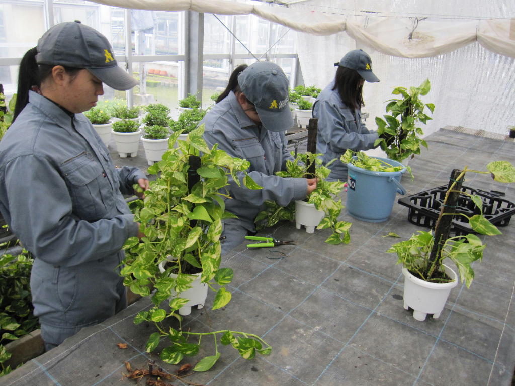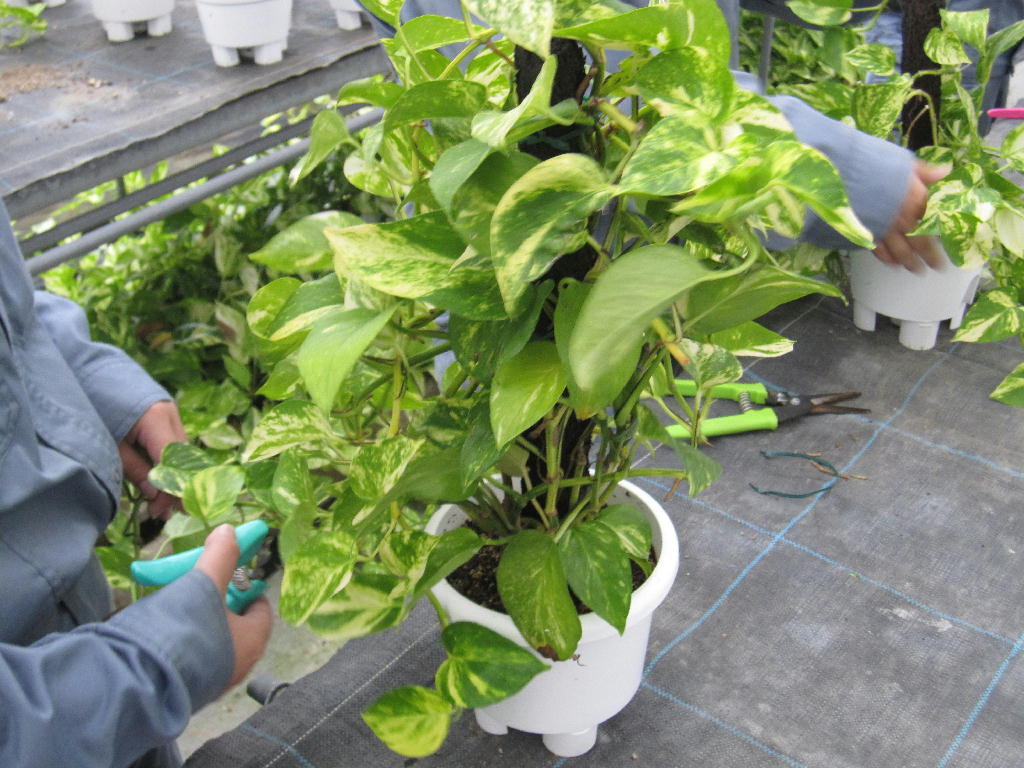 そこで2年生の授業でボサボサなポトスを少し切り戻しを行って、すっきりさせて「スタイリッシュ」に仕上げていきます。