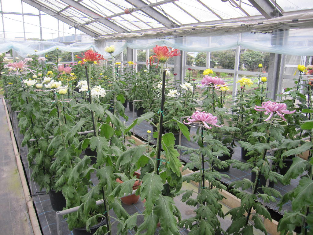 2年生で栽培している大菊が咲いてきました。まだ全部ではないですが、色とりどりで花弁も厚いものがあったり、細く管(くだ)のようになっているものがあり、とってもきれいです。