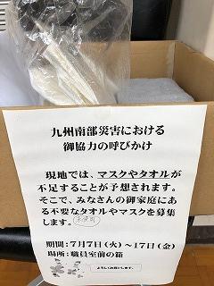 この度の思いもよらぬ豪雨災害にあわれた被災地の一日も早い復興を願い、本渡校舎のボランティア愛好会・マリン校舎のボランティア部では、不要なタオルやマスク等を生徒や職員等で募集しています。