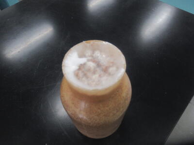 栽培びんの底まで菌が生育したので、びんの口部の古い種菌の塊等をかきとりました。