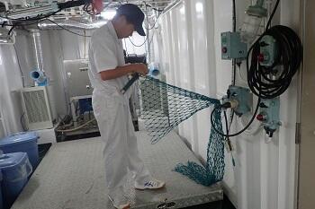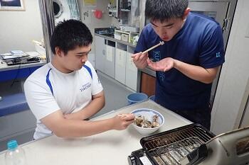 また、この3日間の間には救命艇の降下、操縦訓練を行ったほか、釣獲実習で釣れたアジなどをさばく練習なども行いました!!