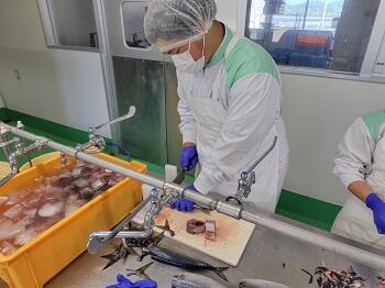 | サバを缶の高さに合わせてカットします | サバを計量して缶に詰めます |