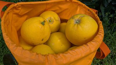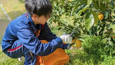 生物生産科果樹専攻が丁寧に管理している果樹園に赴き、マーマレードの原料となる「晩柑」の収穫体験をしました。