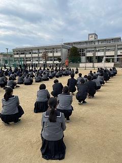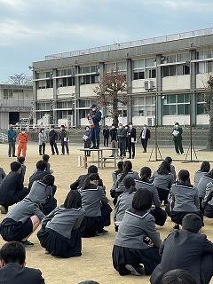 令和3年2月12日(金)本渡校舎にて、通報・消火・避難訓練が実施されました。避難後の全体会では、天草広域連合中央消防署から二名の隊員による全体講評と水消火器による消火器使用訓練が行われました。