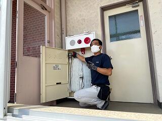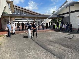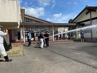 令和3年8月25日(水)本渡校舎にて、屋内消火栓の使用方法について理解を深めるため、先生方が実際に消火栓を使用した消火訓練を行いました。