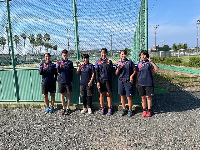 令和5年度熊本県高校総体では、女子団体戦ベスト16位、女子個人戦ベスト64位という結果でした。年度当初に立てた目標までは一歩届きませんでしたが、チーム一丸となり試合の最後まで頑張り、そして楽しむことができました。応援ありがとうございました。6月の総体後は新チームとなり、女子部員は2名となりましたが、部活動の日頃の練習だけでなく、地域のボランティア活動にも参加しながら、部活動とともに高校生活を充実したものにしています。