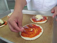 生地をしっかりこね、まとまったら35度の温度で発酵を行います。発酵後、生地を分割して円盤状に伸ばしていきます。トッピングをして、280度~300度のオーブンで8~10分焼き上げ完成です