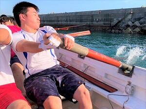 毎年7月に行われる九州各県の水産海洋系高校が全国大会出場を目指してタイムを争うカッターレース大会に向けて、部員たちは「一漕入魂」を合言葉に日々の練習を頑張っています。