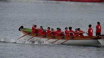 「カッター」とは、大型船に搭載されている救命艇のことで、漕ぎ手12名、艇指揮1名、艇長1名の14名で船を操船します。