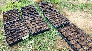 はじめは大きめのプランターに種をまいて小さな芽が多数出てきました。それを、生徒達の手でポット1つ1つに移植して成長を待っています。