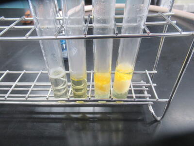 アミノ酸やたんぱく質の存在を確認する、定性実験を行いました。