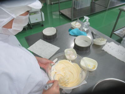 12月にクリスマスケーキ製造を行うので、生地作りの練習を行いました。