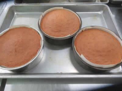 初めての共立て(スポンジ生地を作るときに、卵黄と卵白を分けず全卵で泡立てる方法)による製造で、苦戦しましたが、高さのある生地ができました。