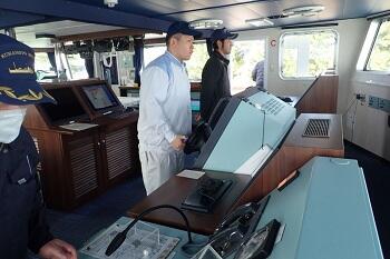 現在、有川湾では風速15メートルの強風が吹いており、湾内でも白波が立つ状況です。船体はやや揺れていますが、生徒に体調不良者はおらず、空き時間には学習に取り組むなど、落ち着いて過ごしています。