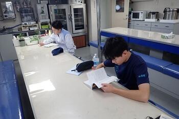 また、釣獲実習に向けて、釣り道具のリールに巻かれているPEラインの状態を確認し、必要に応じて巻き直しやリーダーの結び直しを行いました。生徒が難易度の高い「FGノット」を習得していたため、作業を分担しながら効率よく進めることができました。