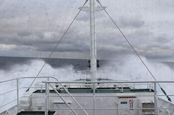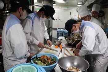 翌16日(木)は、高知県の高知港に入港しました。航行中は、鹿児島県佐多岬を通過した後、遮るもののない海域を進んだため、昼頃まではやや波のある状況が続きました。その影響で一部の生徒に体調の変化も見られましたが、見張りなどの業務に懸命に取り組んでいました。その後、四国に近づき波が穏やかになると体調も回復し、元気に過ごす様子が見られました。