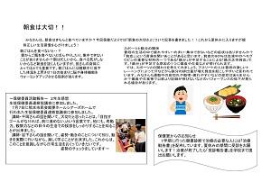 今回の特集は、保健委員紹介、保健委員の日常①、朝食は大切!!、保健委員会活動報告(生徒保健委員連絡協議会)についてです。