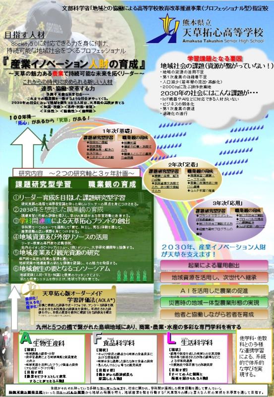 地域が直面する社会問題に対し、解決策を提案し、実行できる産業イノベーション人財の育成を目指し、「天拓プロジェクト」、「職業観の育成」、「天草拓心版オーダーメイド学習評価方法(AOLA)の構築」の取組を行う。