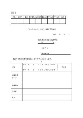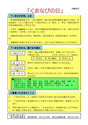 熊本県教育委員会では、子供と家族が一緒に休める環境整備をすすめる目的で、別紙1のとおり「くまなびの日」を導入することとなりました。