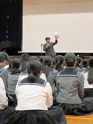 熊本県赤十字献血センターから講師をお迎えし、3年生を対象に献血セミナーを実施しました。輸血や献血の現状、実際の献血の流れなどについて動画などを交えて教えていただきました。講話の中で、「現在の技術では血液を人工的につくることはできず、長期保存も難しい。病気の治療や手術などで輸血を必要としている患者さんの命を救うために、健康な人の新しい血液が必要となるほか、少子高齢化が進むとますます若い世代の献血協力が必要となる。ただし、 献血や輸血を『する』・『しない』は一人一人の意志で選択できる権利である。」とお話されました。