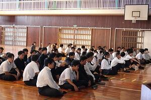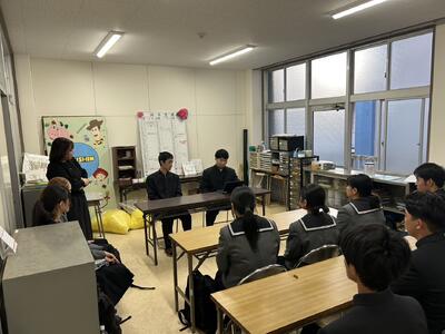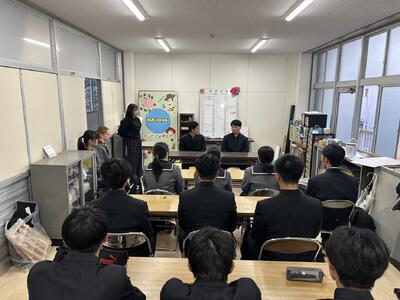 職員講話では、「芸は身を助ける」をテーマにお話があり、働くうえでも“自分の得意なことを見つけ、それを強みにしていくことの大切さ”について学びました。講話をされた先生ご自身も、学生時代に得意だった化学の勉強を努力して伸ばし、その経験が今の仕事につながっていると紹介され、生徒たちは熱心に耳を傾けていました。